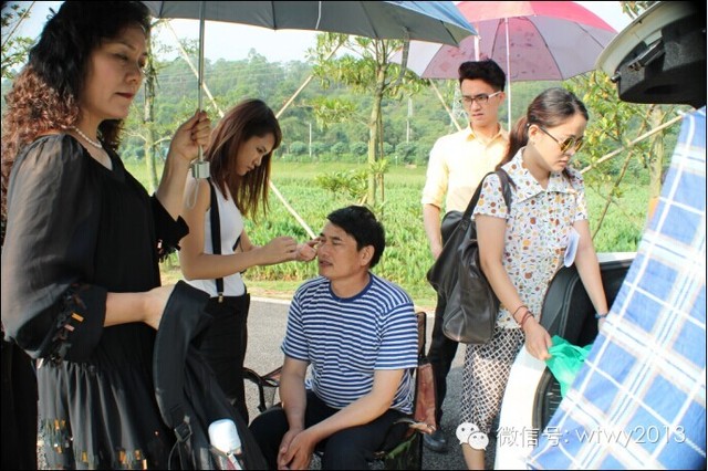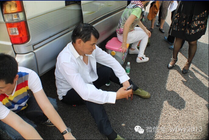 中间休息的时候大衣哥跟剧组成员一杨蹲坐车后阴影处休息乘凉。显露出他朴实的性格。