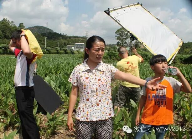 拍摄现场在烈日下的田野。我们的小朋友孙锡堃热得满头大汗。