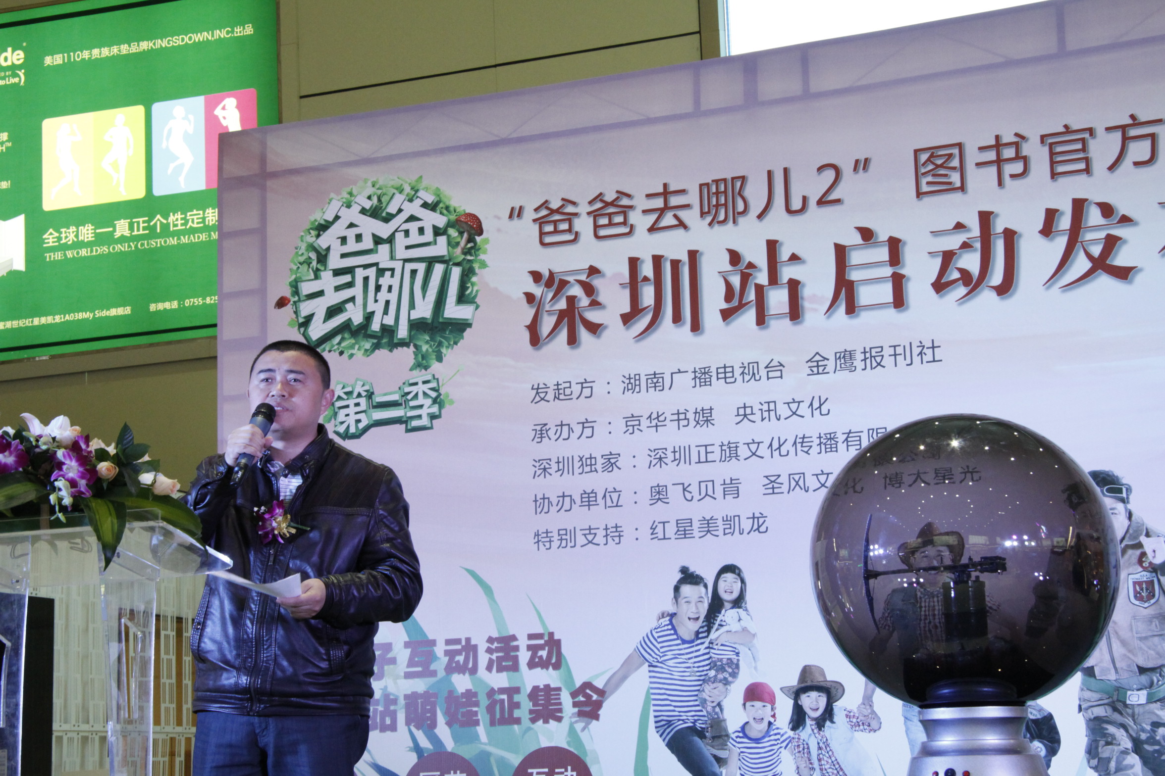 《爸爸去哪儿》第二季图书官方推介互动会”是由湖南广播电视台金鹰报刊社、京华书媒、光明日报社等十余家出版发行机构联合发起,京华书媒和央讯文化全国承办、本地区由深圳正旗文化传播有限公司独家承办的官方图书推介与游戏比拼闯关的创新亲子互动活动,活动得到了知名品牌雅兰床垫、红星美凯龙、顽童无忧等企业的大力支持。