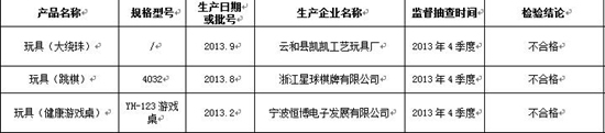 2013年玩具(非电玩具)产品监督抽查结果中不合格产品列表 图片来源:浙江省质量技术监督局网站