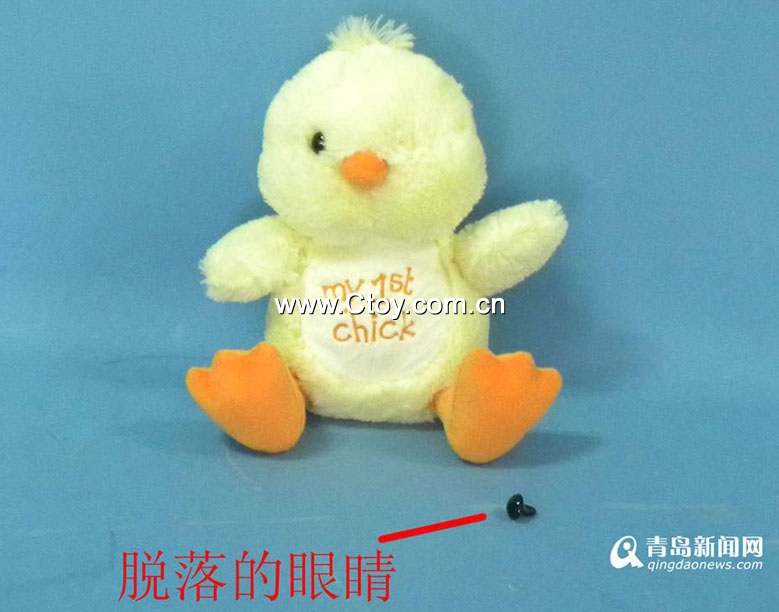 经检验,发现玩具缺少产品名称、适用年龄范围等安全标识,其中1860个、货值0.46万美元鸡、鸭造型的产品眼睛拉力测试不合格。我局监督企业在产品上加缝标有产品名称、适用年龄范围的商品标签,对不符合我国《国家玩具安全技术规范》强制性标准的1860个玩具监督企业进行销毁处理。