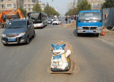 按照王先生的指点,记者昨日来到泉水小区月牙泉路,这尊可爱的“吉祥物”位于月牙泉路与珍珠泉路交叉路口附近,为一对蓝色的小动物母子造型,坐落在马路中间向来往车辆招手。其实就是小孩乘坐的摇摆玩具的车座部分,而它占据的地方是一个窨井。有路人告诉记者,此处井盖已经缺失很长时间了,时常有车辆被无盖的窨井卡住,车轮损坏,后来不知是谁搬来这个“小家伙”,将它盖在井口上,这样过往车辆就会避过危险,“没想到摆在这儿还挺好看的,这也算是月牙泉路上的一个吉祥物吧,哈哈!”