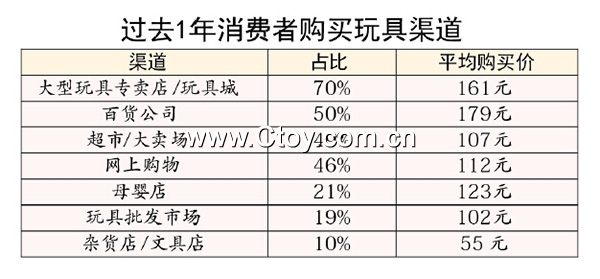 近期,香港贸发局的《中国内地玩具消费调查》指出,大型玩具专卖店或玩具城是过去1年家长曾经为孩子选购自用玩具的主要渠道(占70%);其次是百货公司(占50%)。 而在平均购买价格方面,大型玩具专卖店的平均购买价为161元,而百货公司的平均购买价则最高,达到179元。