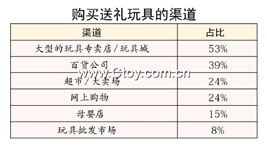 在国内,玩具经常扮演着"礼品"的角色,因此,过去消费者需要选购玩具作送礼之用多到百货公司选购。然而自玩具"反"斗城等大型玩具专卖店进入国内后,玩具内销终端渠道也发生了不少的变化。《中国内地玩具消费调查》统计显示,过去1年曾经购买玩具作送礼用途的受访者中,选择到大型的玩具专卖店或玩具城购买的最多,占53%,百货公司仅以39%的占比排名第二。