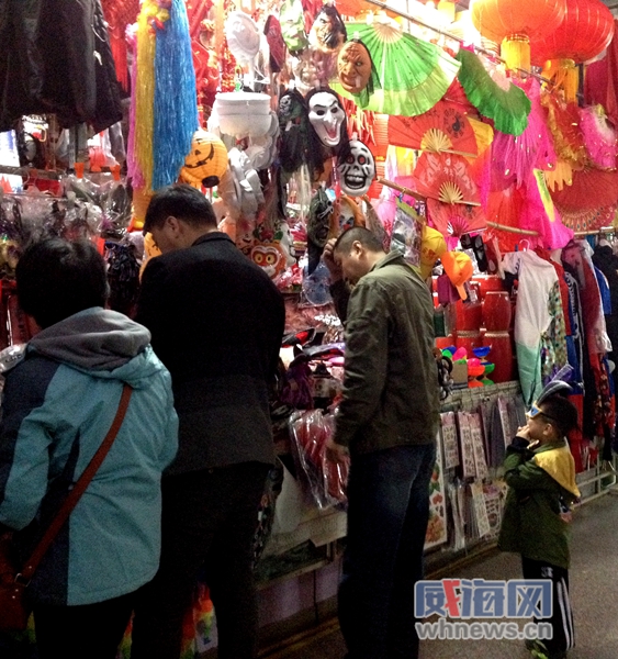 “这几天,大件的玩具基本都卖完了,就剩下面具和挂件了。”29日上午,在市区一家批发市场一楼,一家玩具店的老板告诉记者,最近一段时间,万圣节的玩具热卖,一个多周前供货方就开始缺货了。记者看到,这里共有七八家玩具店,家家都把万圣节玩具挂在门口最显眼的位置,既有普通的南瓜灯、巫师帽、黑斗篷等,也有血腥恐怖的鬼脸面具、滴血僵尸、人造伤疤、骷髅等。