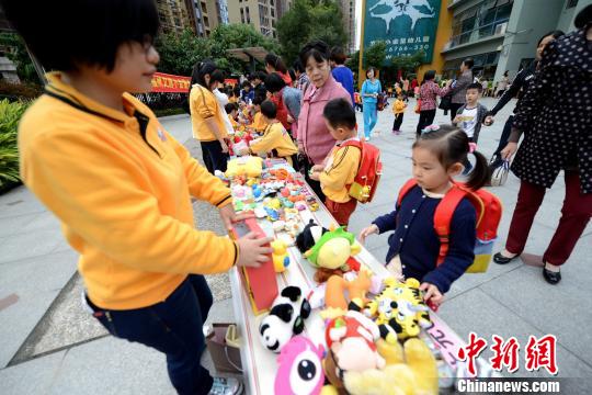 11月14日,福州文博小金星幼儿园的孩子们将自己家里的玩具带到学校“跳蚤市场”义卖,活动受到孩子家长的热情支持,义卖所得款全部捐献给福州福利院的小朋友。王东明 摄
