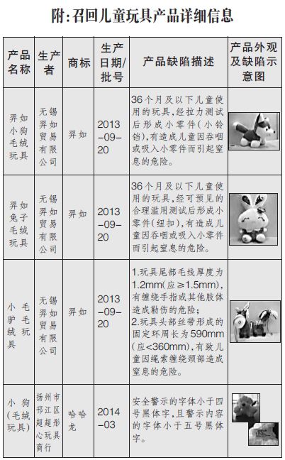 (记者何 可)日前,江苏省无锡羿如贸易有限公司、扬州市邗江区超超彤心玩具商行两家玩具生产企业按照《儿童玩具召回管理规定》的要求,向江苏省质监局备案了儿童玩具主动召回计划,决定对其生产的4批次共计660件存在缺陷的儿童玩具产品实施召回。