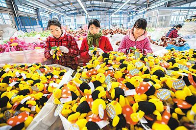 圣诞、新年临近,江苏省连云港市赣榆区近百家玩具企业迎来生产和销售的高峰期。据统计,今年1至11月份,该区玩具出口量已突破500万件,出口创汇近7000万美元,创历史新高。图为一家玩具企业员工在赶制出口欧美市场的玩具。