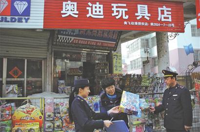 春节期间儿童玩具礼品处于销售旺季,由此引发的消费投诉较多。节后上班第一天,黄岛区市场监督管理局香江路市场监管所针对玩具市场商品质量良莠不齐的现状,开展了以“关注玩具,放心消费”为主题的玩具市场整治行动。执法人员对奥迪玩具店等辖区15家重点玩具市场进行全面检查(上图),严厉打击不符合强制认证标准的产品、不合格产品、侵权产品,打击销售色情、暴力、恐怖等不良玩具的违法行为,为市民春节期间的玩具礼品消费打造一个放心的市场环境。