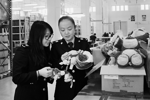 图为近日浦东局工作人员对迪士尼进口玩具实施监管。