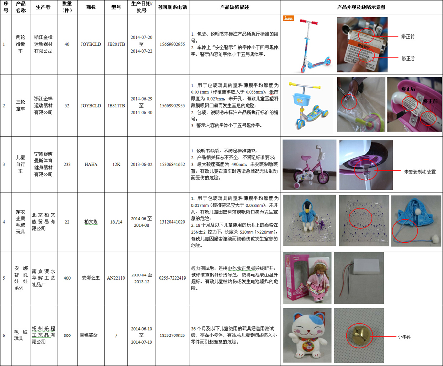 6批次缺陷儿童玩具产品被生产企业主动召回