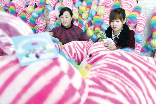 4月14日,江苏省连云港市赣榆经济开发区一家企业工人正在生产出口玩具。今年以来,受国际市场回暖的影响,连云港市一些玩具生产企业出口欧美等国家和地区市场的礼品玩具订单猛增,工人们加班加点赶制产品,满足出口市场需求。