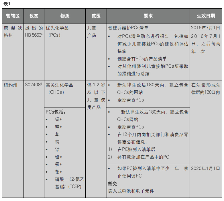 自2015年初以来,康涅狄格州、纽约州和俄勒冈州出台了若干议案,以创建PCs和CHCs清单,限制其在儿童产品中的使用。