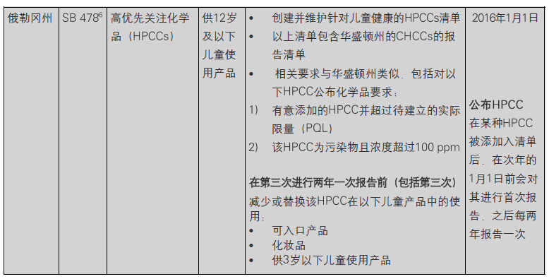 俄勒冈州的提案将建立儿童产品高优先关注化学品(HPCCs)清单6。 HPCCs清单中同时也包含华盛顿州的CHCCs清单报告内容。报告HPCCs的条件与华盛顿州的报告条件相似,包括存在的HPCC为: