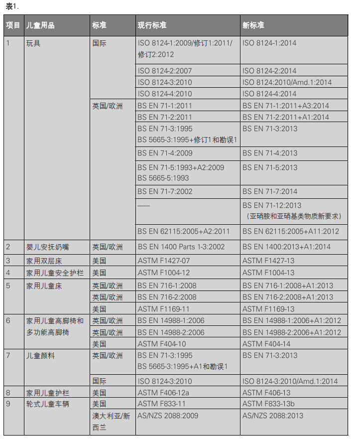 表1总结了玩具和儿童用品现行标准和更新标准的要点内容。