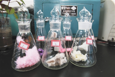 实验人员将毛绒玩具样品取样装入容器,其中两种测出含有甲醛。
