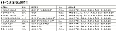 近日,记者从商场、玩具精品店、市场及路边摊购买了8种毛绒玩具样品,检测结果显示,8种样品中均含少量重金属,还有2种样品含有甲醛,且超出纺织材料甲醛含量的相关标准。这2种样品均购自路边摊。