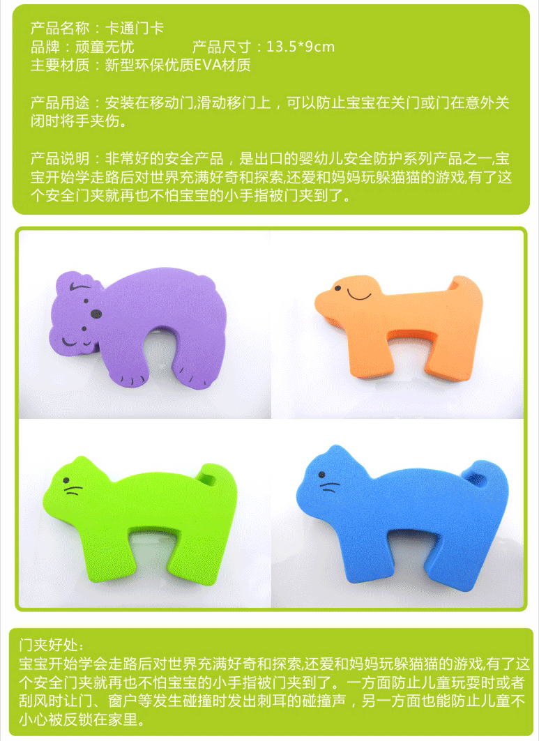 宝宝开始学会走路后对世界充满好奇和探索,还爱和妈妈玩躲猫猫的游戏,有了这个安全门夹就再也不怕宝宝的小手指被门夹到了。一方面防止儿童玩耍时或者刮风时让门、窗户等发生碰撞时发出刺耳的碰撞声,另一方面也能防止儿童不小心被反锁在家里。